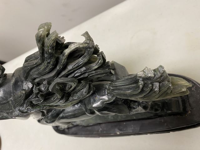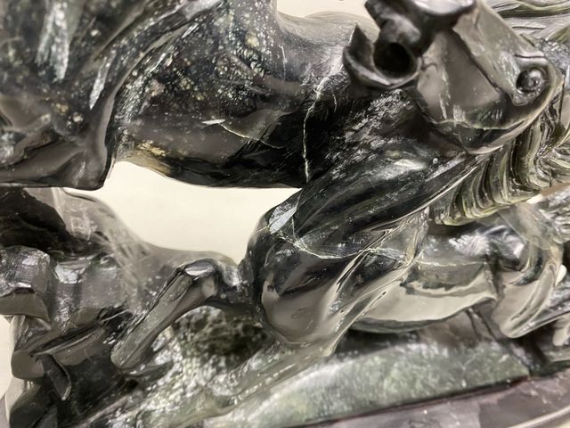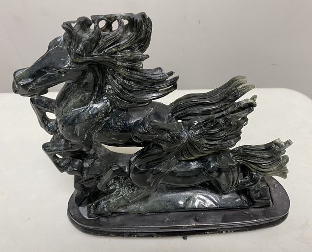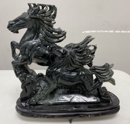 Jade Like Stone Horse Statue, wood base, has chips and crack. 12.5" h., 13" w., 4" d. Jade Like Stone Horse Statue, wood base, has chips and crack. 12.5" h., 13" w., 4" d.