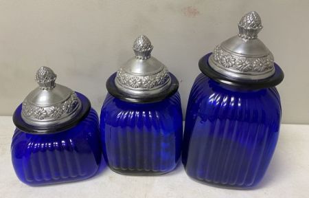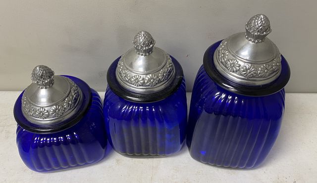 Three Blue glass canisters, assorted sized, tallest is 12"h. Three Blue glass canisters, assorted sized, tallest is 12"h.