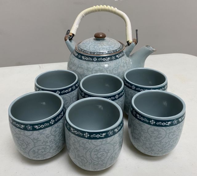 Oriental style tea set, coffee pot, 6 cups, modern/new decor. Oriental style tea set, coffee pot, 6 cups, modern/new decor.