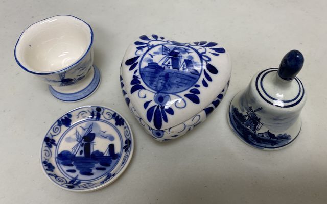 Holland Delft Ware Pieces, trinket heart box, dish, vase, bell, mini pieces. Holland Delft Ware Pieces, trinket heart box, dish, vase, bell, mini pieces.