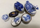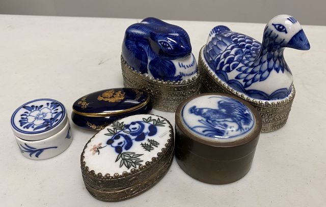 Group of Chinese pill boxes, assorted style and sized, Rabbit and duck, blue and white porcelain. Group of Chinese pill boxes, assorted style and sized, Rabbit and duck, blue and white porcelain.