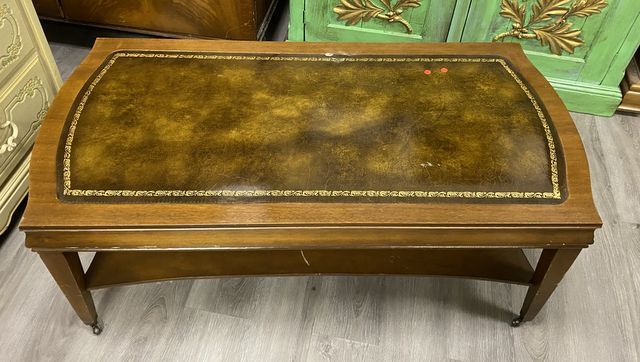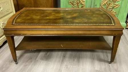 French Provincial Mahogany Coffee Table, leather top, two tier, has scratches on finish, on casters. 15" h., 41" w., 20" d. French Provincial Mahogany Coffee Table, leather top, two tier, has scratches on finish, on casters. 15" h., 41" w., 20" d.