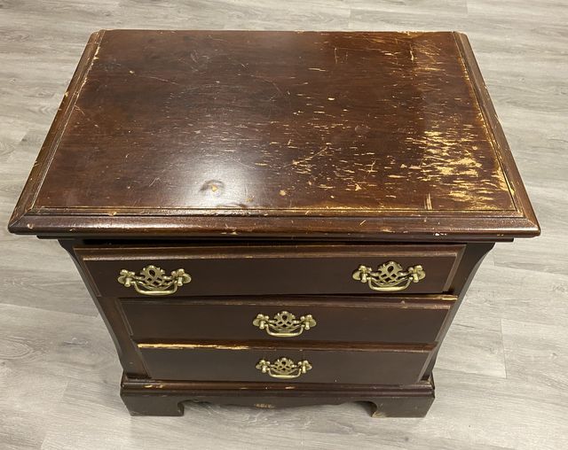 Late 20th Century Cherry Nightstand, Early American style, two drawers, finish is worn. 23" h., 22" w. Late 20th Century Cherry Nightstand, Early American style, two drawers, finish is worn. 23" h., 22" w.