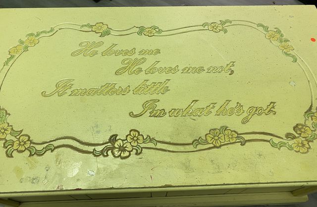 Vintage factory painted storage trunk, lift top, with quote on top. 19" h., 36" w., 16" d. Vintage factory painted storage trunk, lift top, with quote on top. 19" h., 36" w., 16" d.