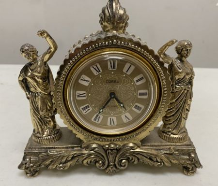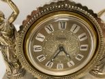 Small Carol Brass Figural Clock, man and woman, light tarnish, 5 1/2"h., 6"w. Small Carol Brass Figural Clock, man and woman, light tarnish, 5 1/2"h., 6"w.