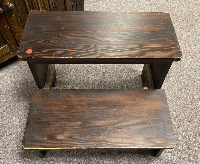 Pine stained steps, two step, has wear. 17" h., 19" w., 22" d. Pine stained steps, two step, has wear. 17" h., 19" w., 22" d.