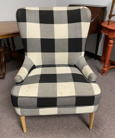 Mid Century Upholstered Arm Chair, black and white striped pattern, 40"h. Mid Century Upholstered Arm Chair, black and white striped pattern, 40"h.