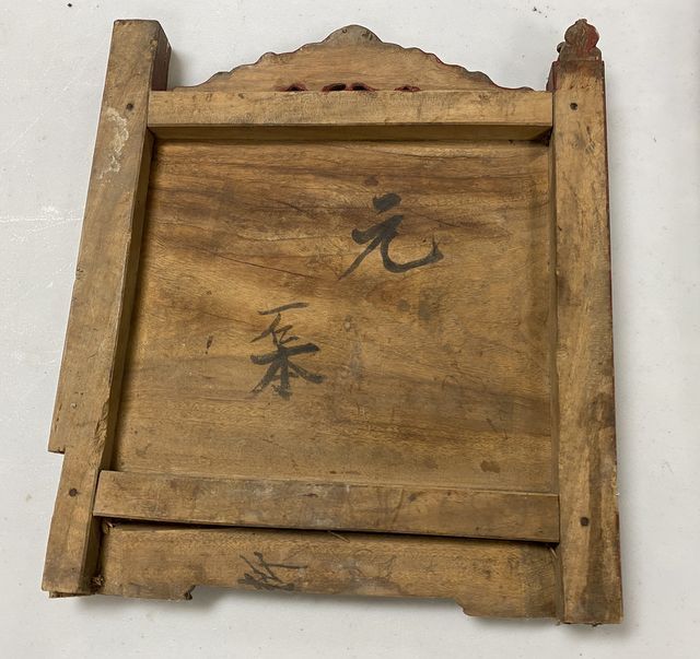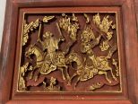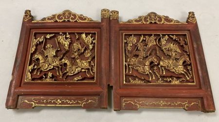 Two Hand Carved Chinese Panels, hand painted, vintage. 13.5" h., 12" w. Two Hand Carved Chinese Panels, hand painted, vintage. 13.5" h., 12" w.
