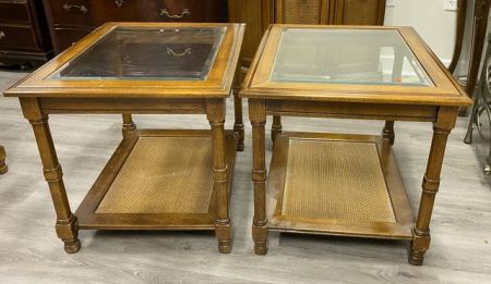 Pair of mahogany side tables, two tier, glass tops, light wear. 21" h., 27" w., 21" d. Pair of mahogany side tables, two tier, glass tops, light wear. 21" h., 27" w., 21" d.