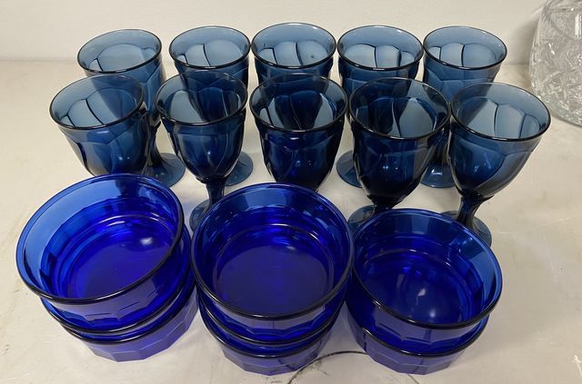 10 Blue Fostoria Glasses and 8 Blue Salad Bowls 10 Blue Fostoria Glasses and 8 Blue Salad Bowls