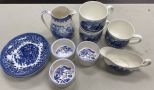 Group of Blue and White Pottery Pieces, Wedgwood, Red River, plates, pitcher, gravy, cups. Group of Blue and White Pottery Pieces, Wedgwood, Red River, plates, pitcher, gravy, cups.