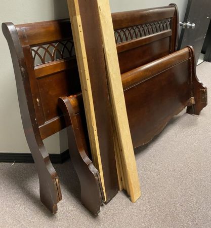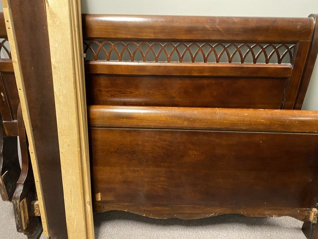 Vintage Cherry Sleight Style Queen Bed, wood rails, has scratches on finish, wood rails. Vintage Cherry Sleight Style Queen Bed, wood rails, has scratches on finish, wood rails.