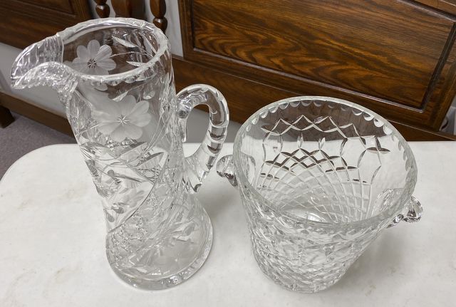 Heavy Etched Large Pitcher, floral designs, and Ice Bucket, heavy, pressed glass. Heavy Etched Large Pitcher, floral designs, and Ice Bucket, heavy, pressed glass.