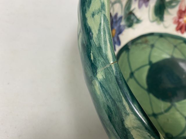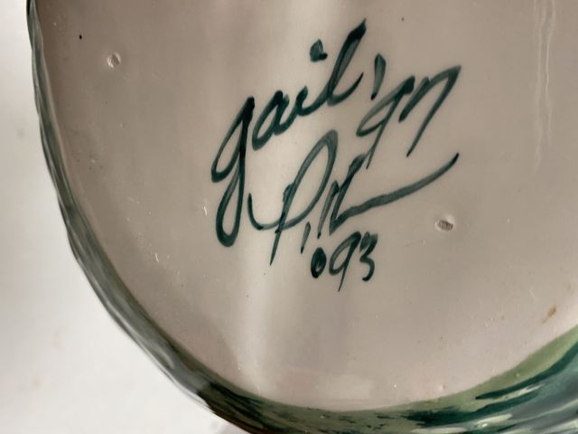 Gail Pittman ceramic basket, hand painted, signed, has crack on edge. 10" h., 13" w. Gail Pittman ceramic basket, hand painted, signed, has crack on edge. 10" h., 13" w.