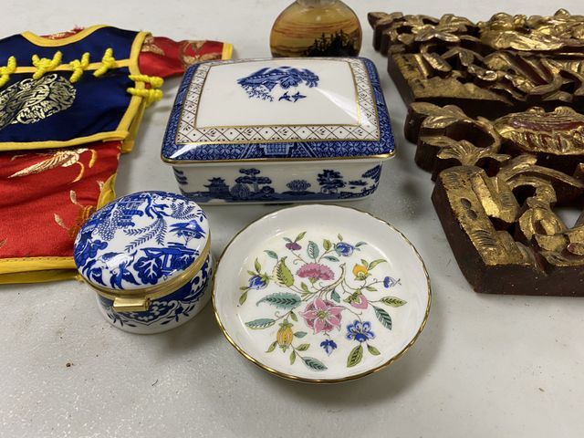 Group of Chinese Decor Pieces, carved wood panels, trinkets, mini dress. Group of Chinese Decor Pieces, carved wood panels, trinkets, mini dress.
