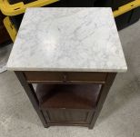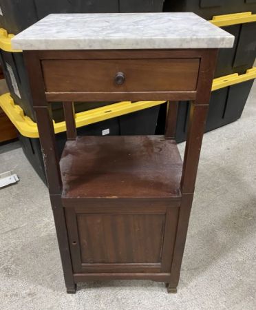 Vintage Mahogany Marble Top Side Table, white marble, single drawer, two tier. 32"h., 16"w. Vintage Mahogany Marble Top Side Table, white marble, single drawer, two tier. 32"h., 16"w.