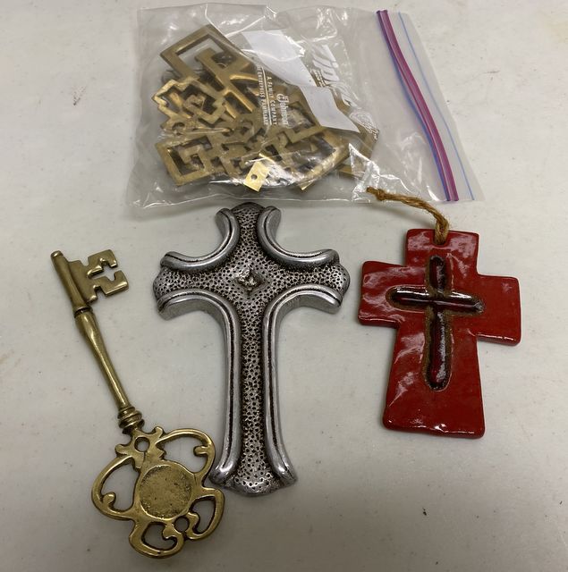 Brass accent pieces, brass key, metal cross, pottery cross. Brass accent pieces, brass key, metal cross, pottery cross.