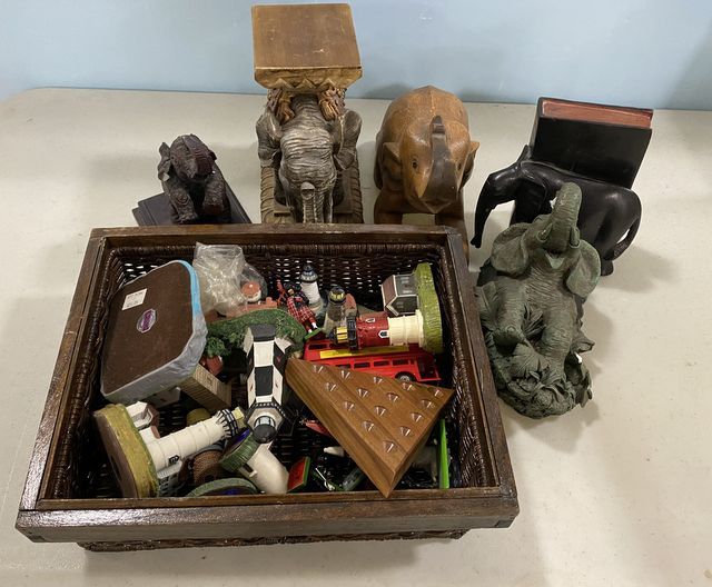Group of decorative figurines, Elephant figurines, bookends, Light House Figurines, and basket. Group of decorative figurines, Elephant figurines, bookends, Light House Figurines, and basket.