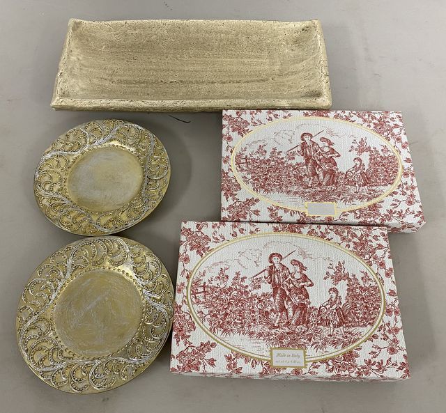 Group of Decorative Items, two boxes of soap, rectangle tray, two gold gilt plates. Group of Decorative Items, two boxes of soap, rectangle tray, two gold gilt plates.
