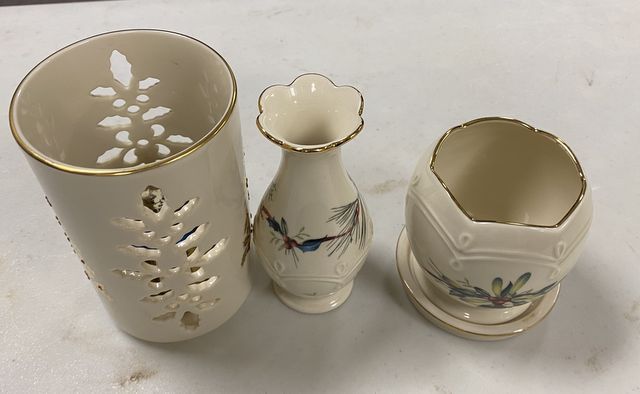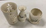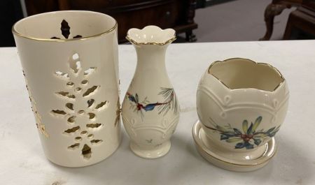 Three Porcelain Pieces, candle holder, flower vase, small vase, Lenon Season Greetings. Three Porcelain Pieces, candle holder, flower vase, small vase, Lenon Season Greetings.