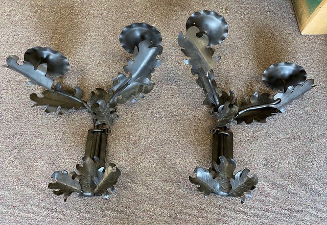 Pair of Metal Wall Candle Holders, leaf design, two arm candle holders, 20" h., 17" w. Pair of Metal Wall Candle Holders, leaf design, two arm candle holders, 20" h., 17" w.