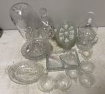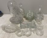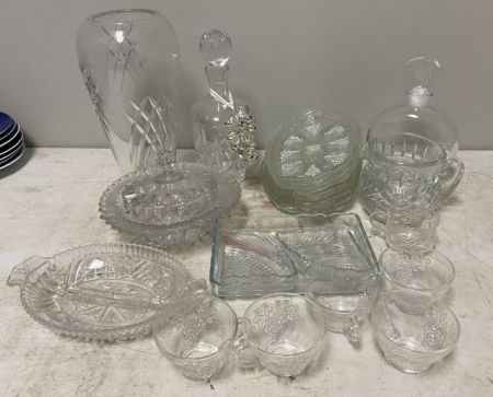 Large Group of Clear Glass Pieces, pressed glass pieces, flower vase, decanter, luncheon plates, divided dish, cups. Large Group of Clear Glass Pieces, pressed glass pieces, flower vase, decanter, luncheon plates, divided dish, cups.