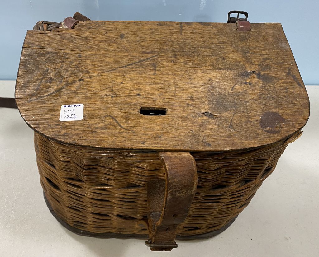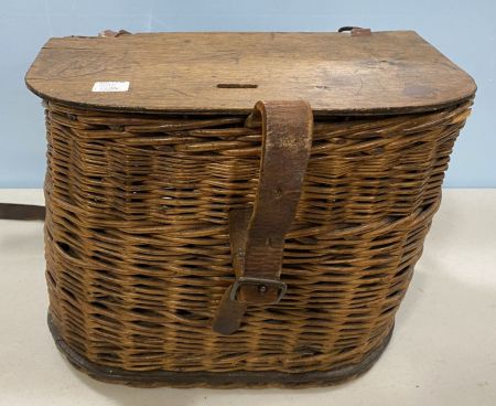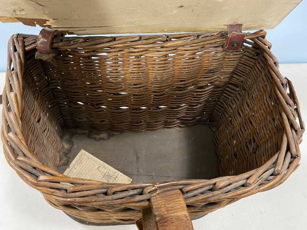 Vintage Woven Picnic Carrying Basket, wood lift top has damage, leather straps, 11"h., 15"w. Vintage Woven Picnic Carrying Basket, wood lift top has damage, leather straps, 11"h., 15"w.