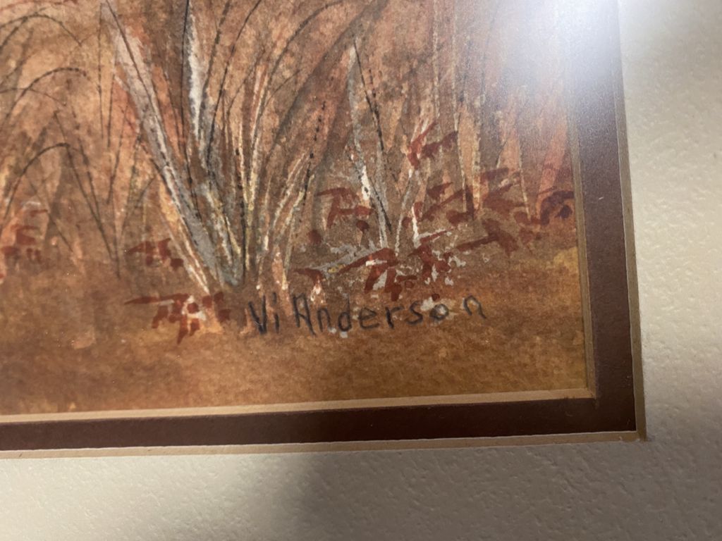Vi Anderson Watercolor Landscape, matted, framed signed lower right, glassed, 21"h., 18"w. Vi Anderson Watercolor Landscape, matted, framed signed lower right, glassed, 21"h., 18"w.