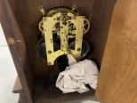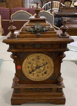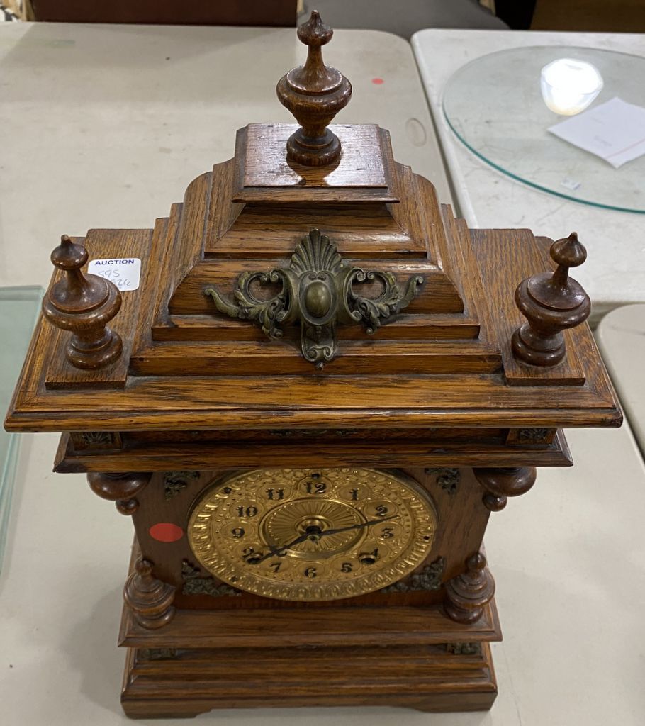 Ansonia Clock Co. Oak Mantle Clock, finials, missing face cover, has pendulum and weights, 19"h., 11"w. Ansonia Clock Co. Oak Mantle Clock, finials, missing face cover, has pendulum and weights, 19"h., 11"w.