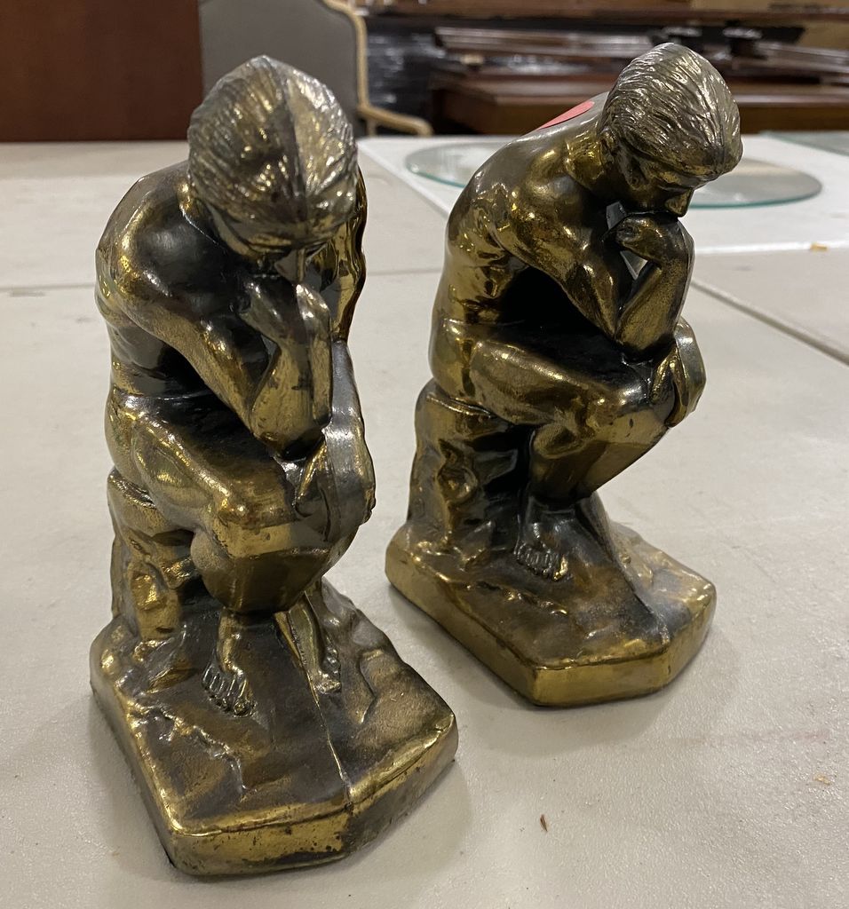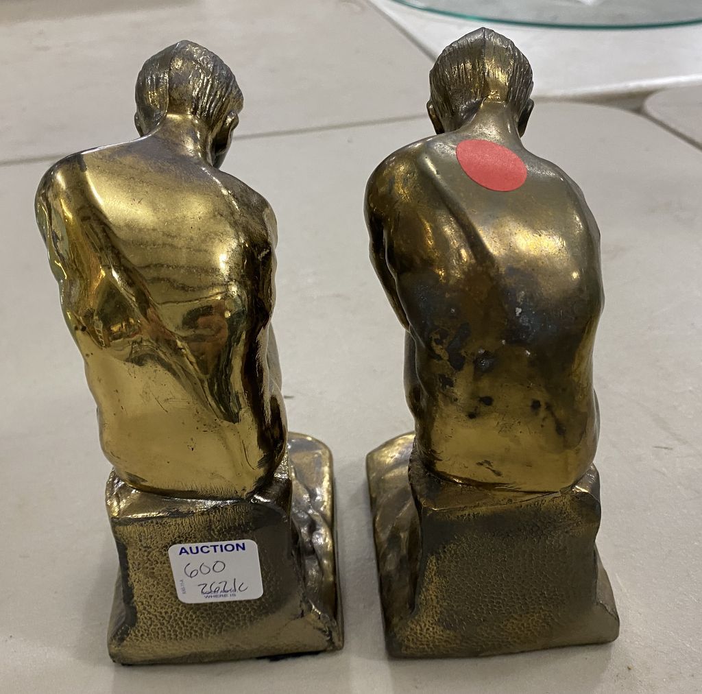 Pair of Brass Thinking Man Bookends, have finish wear, 7"h. Pair of Brass Thinking Man Bookends, have finish wear, 7"h.