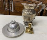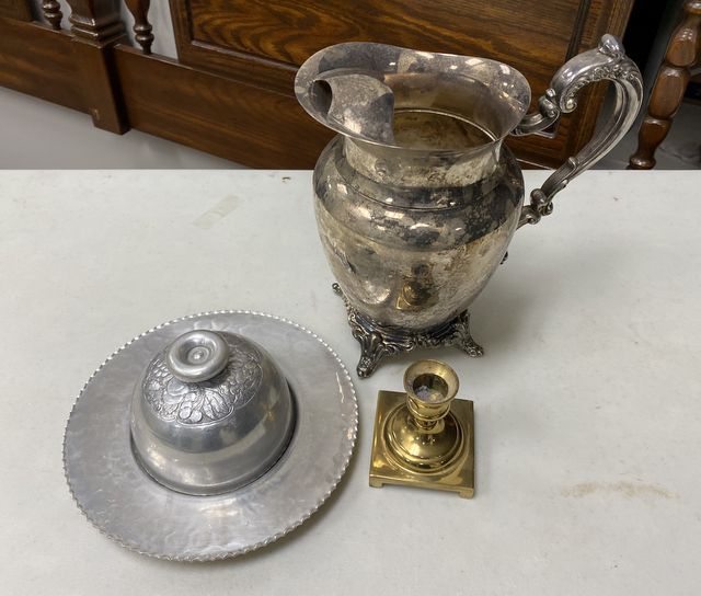 603 Metal Cheese Dome, Silver Plate Pitcher and Brass Candle Stick