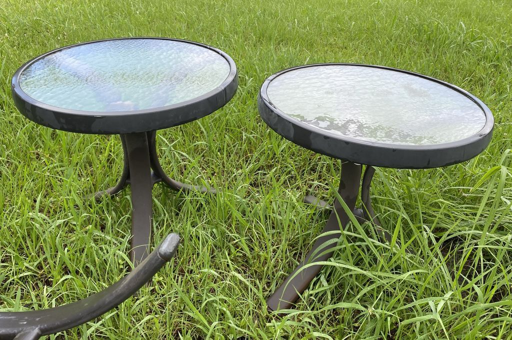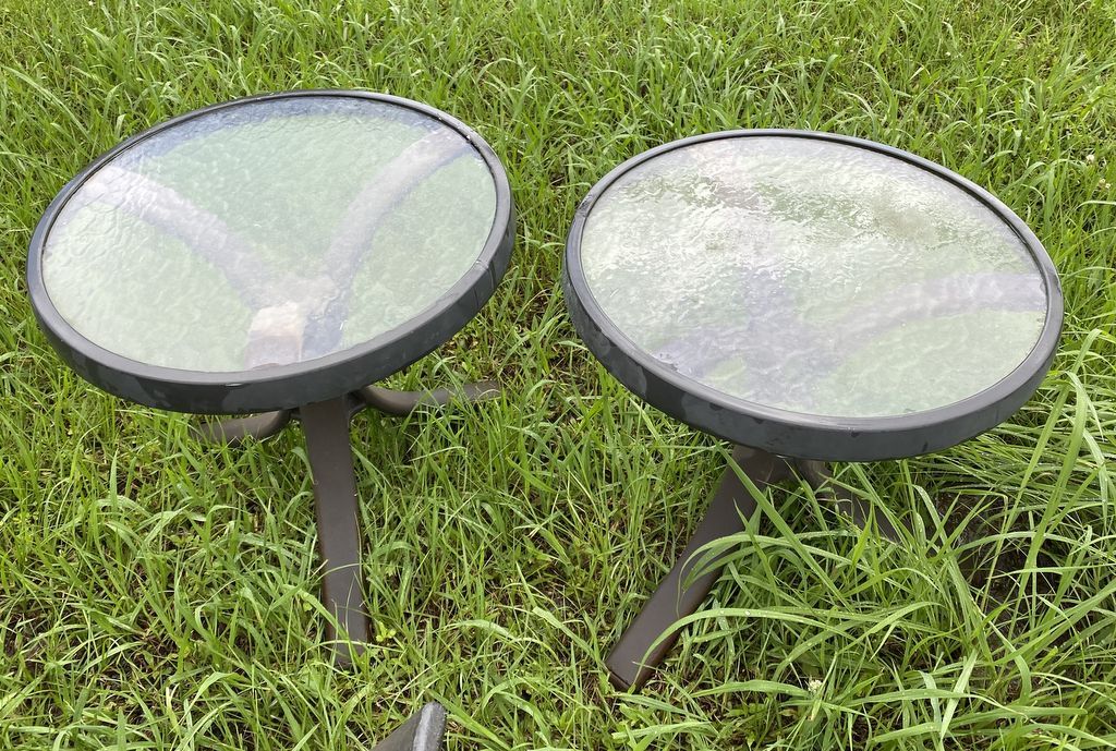 Two Metal and Glass Outdoor Tables, pedestal tables, weathered. Two Metal and Glass Outdoor Tables, pedestal tables, weathered.