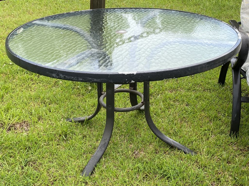 Metal and Glass Outdoor Patio Table, weathered condition. Metal and Glass Outdoor Patio Table, weathered condition.