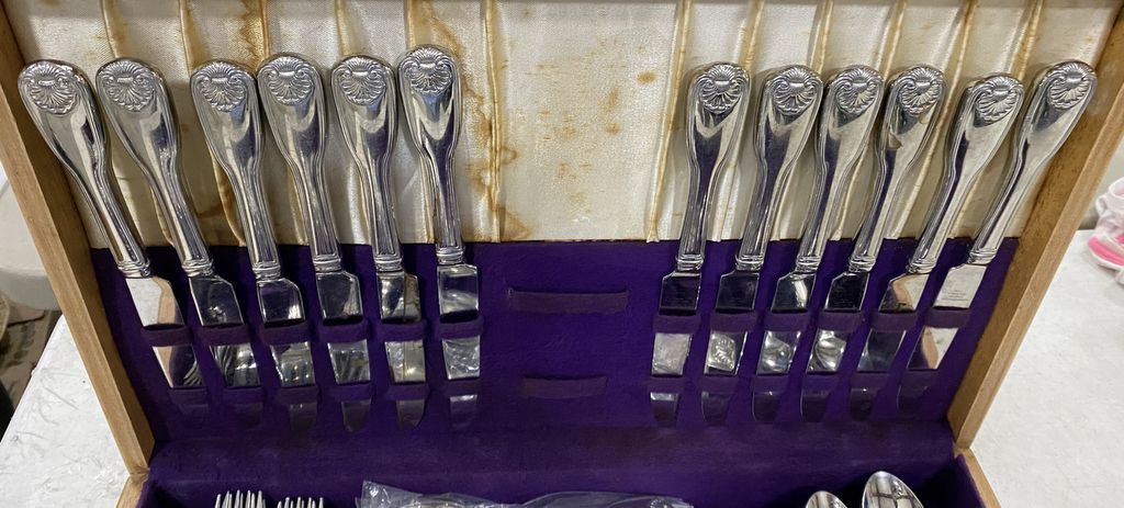 Reed & Barton 18/10 Stainless Flatware Set, 12 dinner knives, 8 dinner forks, 6 table spoons, 18 teaspoons, 22 luncheon forks, 1 serving spoon, 67 pieces. Reed & Barton 18/10 Stainless Flatware Set, 12 dinner knives, 8 dinner forks, 6 table spoons, 18 teaspoons, 22 luncheon forks, 1 serving spoon, 67 pieces.