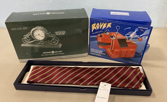 Howard Miller Clock in box, Rover Toy, and Men's New Tie Howard Miller Clock in box, Rover Toy, and Men's New Tie