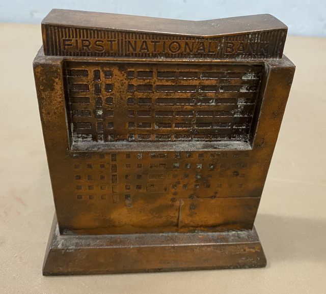 First National Bank Jackson MS Money Bank, vintage, has age wear, 5"h., 4 1/2"w. First National Bank Jackson MS Money Bank, vintage, has age wear, 5"h., 4 1/2"w.