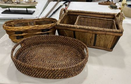 Four decorative baskets, woven style, handled, assorted sized. Four decorative baskets, woven style, handled, assorted sized.