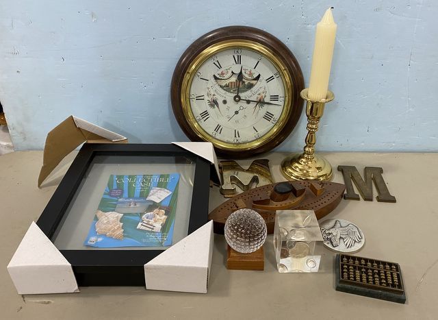 Wall clock, brass candle stick, picture frame, block with coins, and decorative ball. Wall clock, brass candle stick, picture frame, block with coins, and decorative ball.