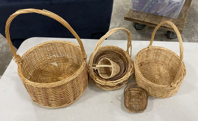 Group of woven decorative baskets, handled, assorted styles. Group of woven decorative baskets, handled, assorted styles.