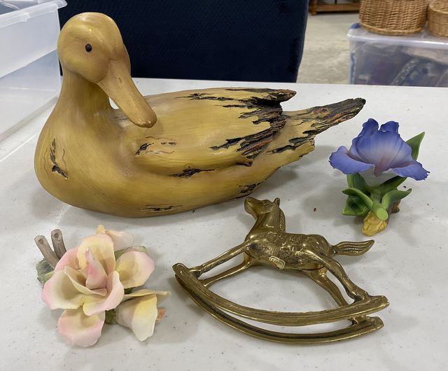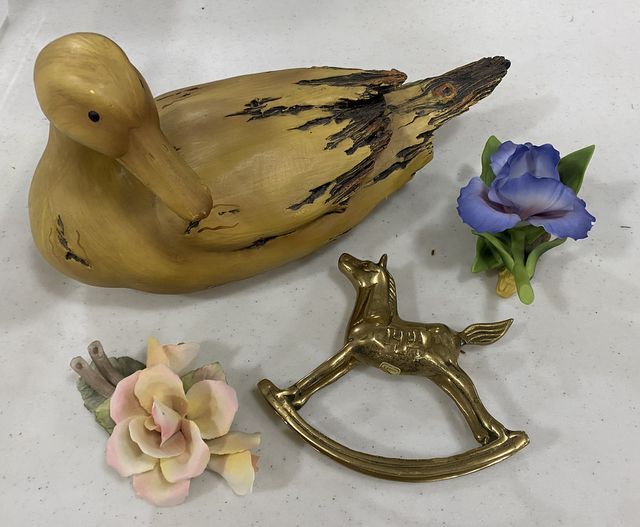 Decorative Wood Duck, Porcelain Andrea Flower and Brass Rocking Horse Decorative Wood Duck, Porcelain Andrea Flower and Brass Rocking Horse
