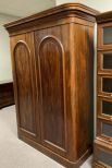 Empire Style Mahogany Wardrobe, burl mahogany, double door, fabric interior lined with drawers, and hanging hooks, three piece, top, middle, base, 83"h., 53"w., 20"d. Empire Style Mahogany Wardrobe, burl mahogany, double door, fabric interior lined with drawers, and hanging hooks, three piece, top, middle, base, 83"h., 53"w., 20"d.