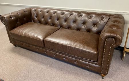 Modern Chesterfield Sofa, two cushion, button tufted, brown, has some wear spots, on back edges, and front arm, on casters, appears to be thin leather, 88"w. Modern Chesterfield Sofa, two cushion, button tufted, brown, has some wear spots, on back edges, and front arm, on casters, appears to be thin leather, 88"w.