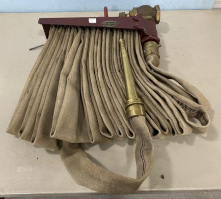 Vintage Wirt & Knox Royal Fire Hose and Rack, wall mount, with original canvas hose and brass nozzle, good condition. Vintage Wirt & Knox Royal Fire Hose and Rack, wall mount, with original canvas hose and brass nozzle, good condition.