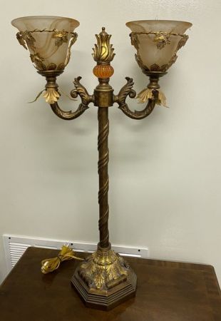 Decorative Italian Gold Gilt Two Arm Lamp, gold color, leaf, frosted glass shades, new decor, 35" Decorative Italian Gold Gilt Two Arm Lamp, gold color, leaf, frosted glass shades, new decor, 35"