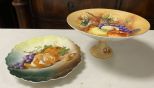 Bavaria Porcelain Compote 4 1/2"h., 10"dia. and matching Plate, hand painted fruit, markers mark. Bavaria Porcelain Compote 4 1/2"h., 10"dia. and matching Plate, hand painted fruit, markers mark.
