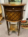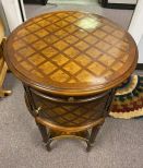 Theodore Alexander Side Lamp Table, parquet design, single drawer, single door, two tier, good condition, 31"h., 17"dia Theodore Alexander Side Lamp Table, parquet design, single drawer, single door, two tier, good condition, 31"h., 17"dia