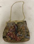 Needle Point Purse, chain, brass clasp, family imagery, 6"h., 8"w. Needle Point Purse, chain, brass clasp, family imagery, 6"h., 8"w.