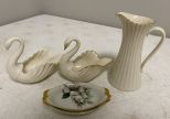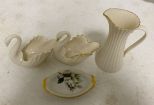 Group of Lexon Porcelain, pitcher 5 1/2"h., two swans, and two porcelain dishes. Group of Lexon Porcelain, pitcher 5 1/2"h., two swans, and two porcelain dishes.