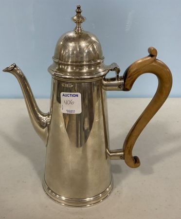 Silver Coffee/Tea/Chocolate Pot, hinged lid, wooden handle, White & Sons, 24.700 ozt, marks are WW, lion, cat, C, Lady., 9 1/2"h. Silver Coffee/Tea/Chocolate Pot, hinged lid, wooden handle, White & Sons, 24.700 ozt, marks are WW, lion, cat, C, Lady., 9 1/2"h.