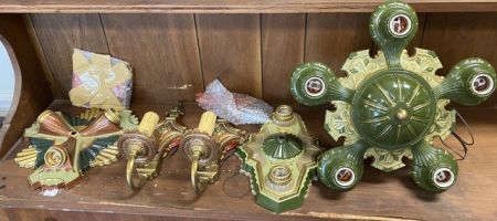 Art Deco style light fixtures, three light fixtures, two wall sconces, hand painted. Art Deco style light fixtures, three light fixtures, two wall sconces, hand painted.